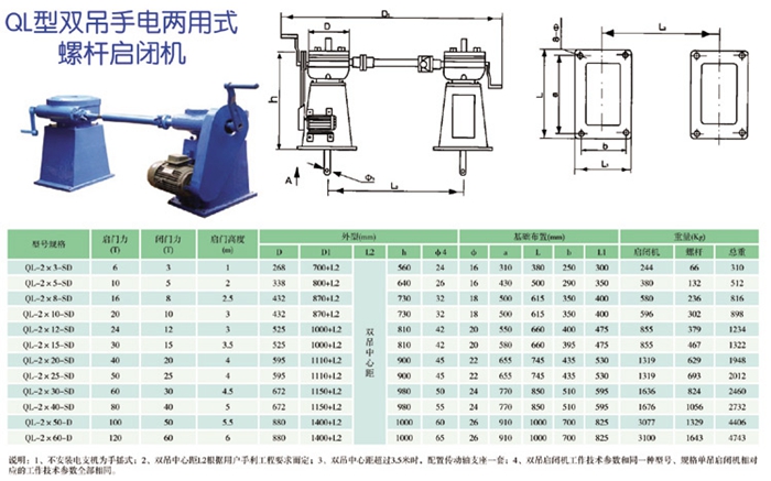 1.雙吊點螺桿式啟閉機廣泛用于:水利水電、水庫、河道、養(yǎng)殖排灌等各種水利工程。本系列啟閉機按吊點數(shù)分為單吊點和雙吊點兩種型號,按驅(qū)動方式分為手動、電動和手電兩用三種形式,一般啟閉容量超過600KN(單機)時不再配置手動機構(gòu)。我公司生產(chǎn)的QL型系列雙吊點螺桿啟閉機啟門力為3KN-650KN,超過650KN(單機)時可特殊設(shè)計。